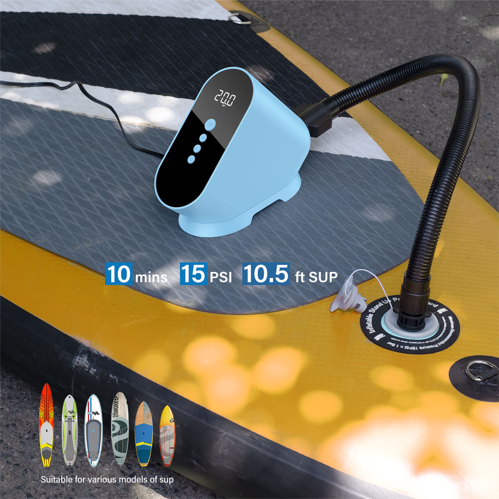Elektrisk 12 volt luftpumpe til oppblåsbart SUP, surfebrett, kano eller kajakk